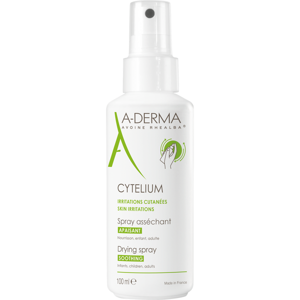 - Aderma Cytelium Drying Spray Soothing 100ml is also alleviating. It owes its properties to the combined actions of its components : - Zinc Oxide : astringent, drying, it is also anti-irritant and antibacterial, - Extract of Rhealba Oats : alleviating, softening, protective. Aderma Cytelium Drying Lotion Spray : - dries out and decongests the zone to treat (oozing skin). - soothes, calms and softens the epidermis in case of irritations. Remarkably tolerated by the most fragile skins. It can be used to babies and children. Cytelium does not colour the skin. Fragrance free, paraben free.