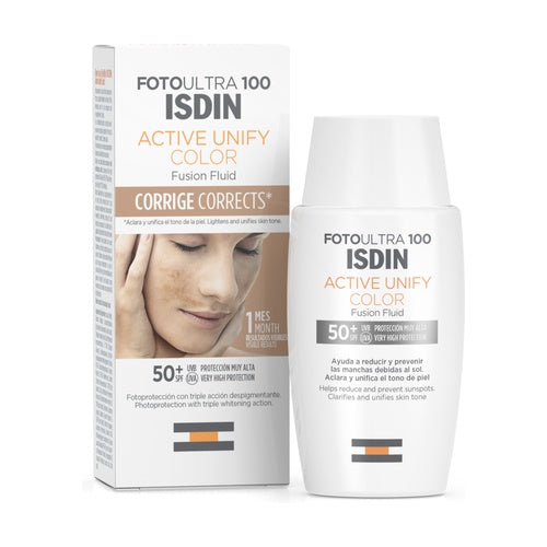 Isdin FotoUltra 100 Active Unify Fusion Fluid SPF50+-50ML is a sunscreen indicated to protect the face prone to hyperpigmentation, that provides a high and broad range protection from the UV rays while unifying the skin tone.