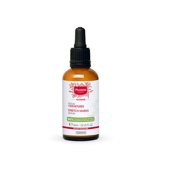 Mustela Stretch Marks Serum-45 ML for pregnant women and new mums acts on new stretch marks with a very targeted action. Formulated with maracuja oil, known for its highly moisturizing properties, this serum helps improve the appearance of stretch marks by strengthening and regaining the skin elasticity. It can be used during pregnancy and after baby’s arrival.
