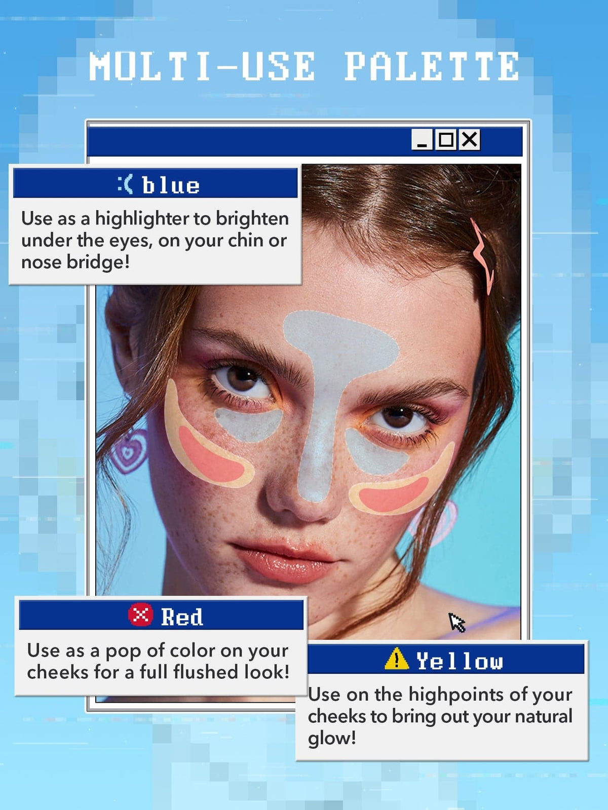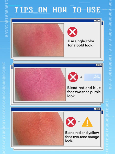 Nope, it's not a glitch! This ultra-unique blush palette features primary colors red, yellow, and blue that can be used alone or mixed for a look all your own! With a fine and easy-to-blend formula, go for an all natural flush or get funky. The choice is yours!