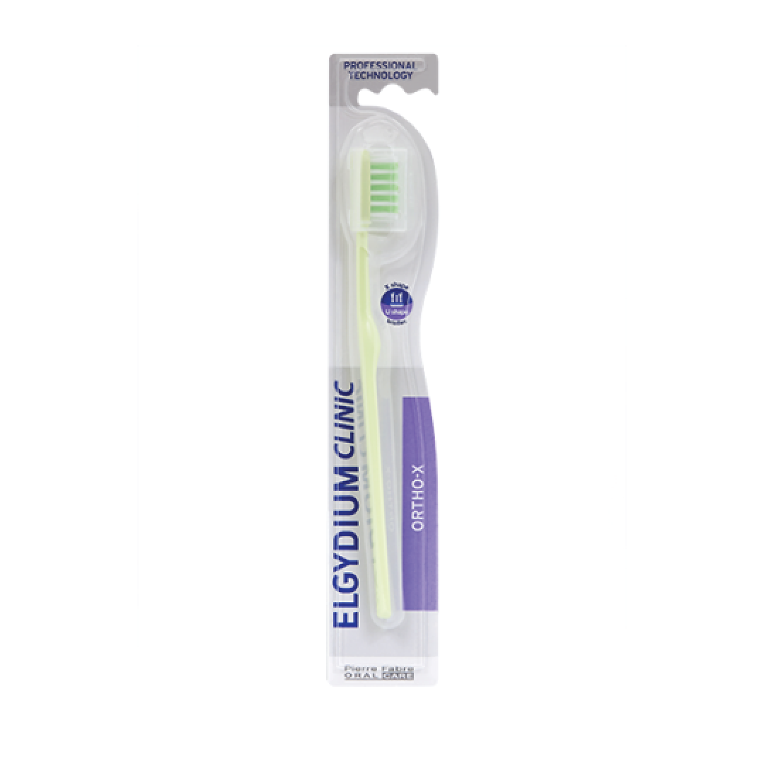 Elgydium Clinic Ortho X Adult Toothbrush is aimed at adults who wear braces. Its patented technology with a crossed bristle pattern is ideal for optimal brushing: the crossed bristles around the edge clean the hard-to-reach areas and the central bristles brush around the brace brackets.