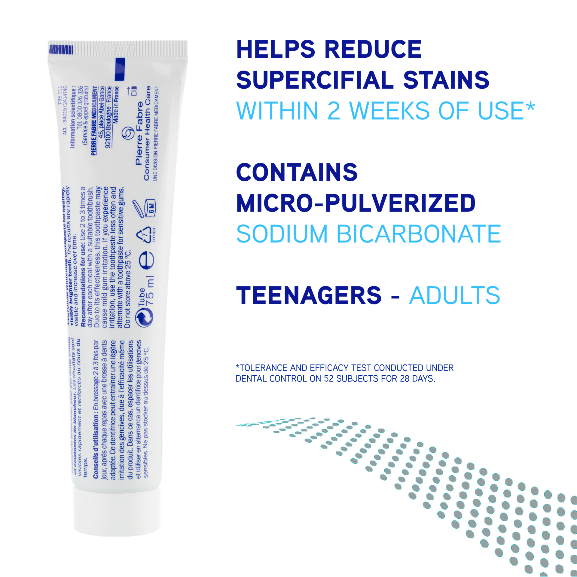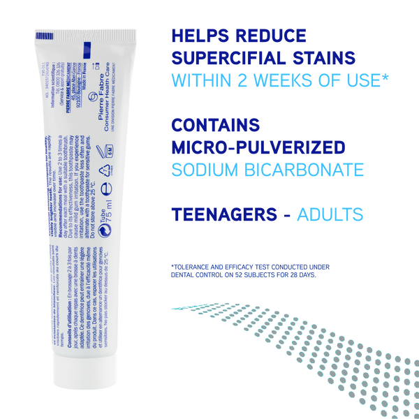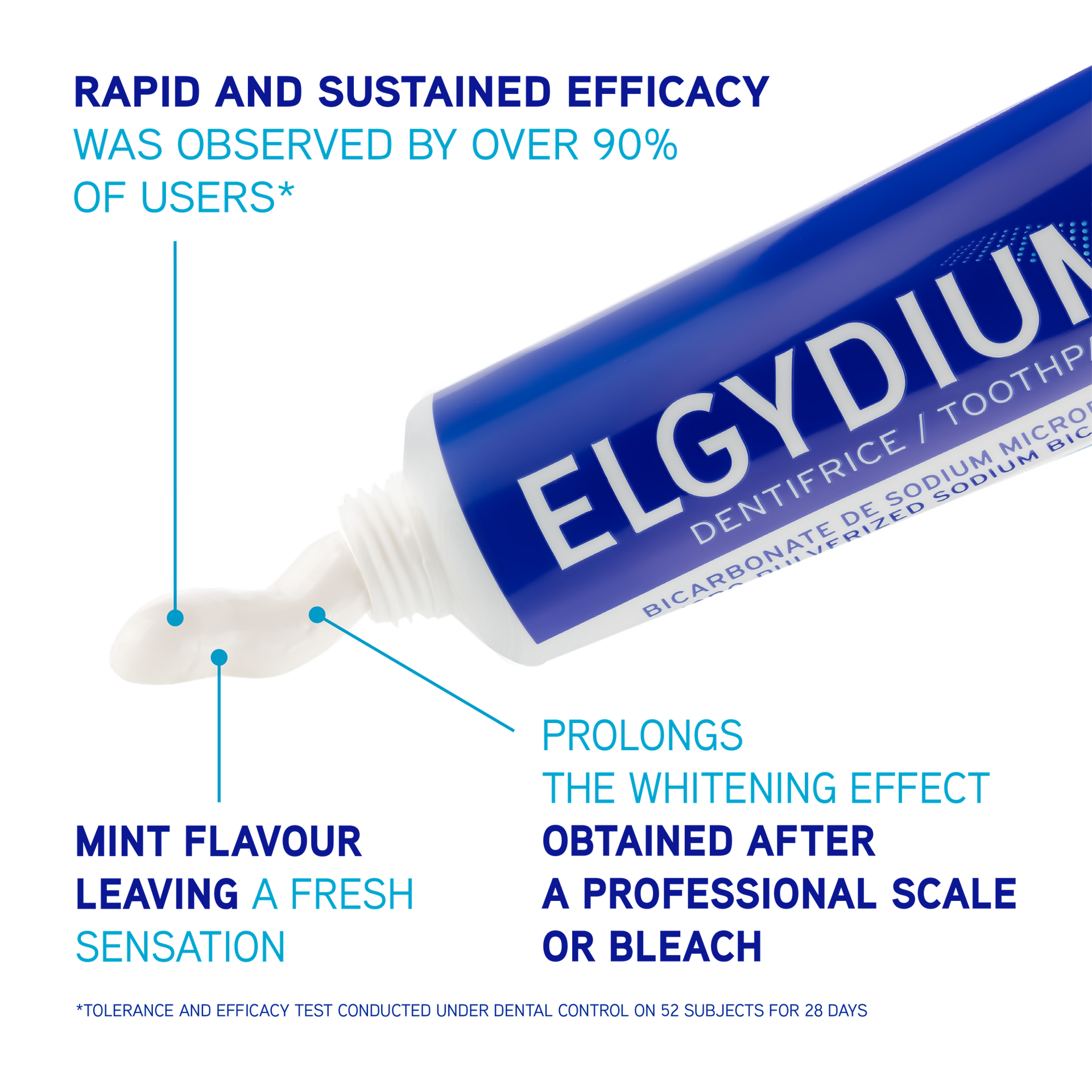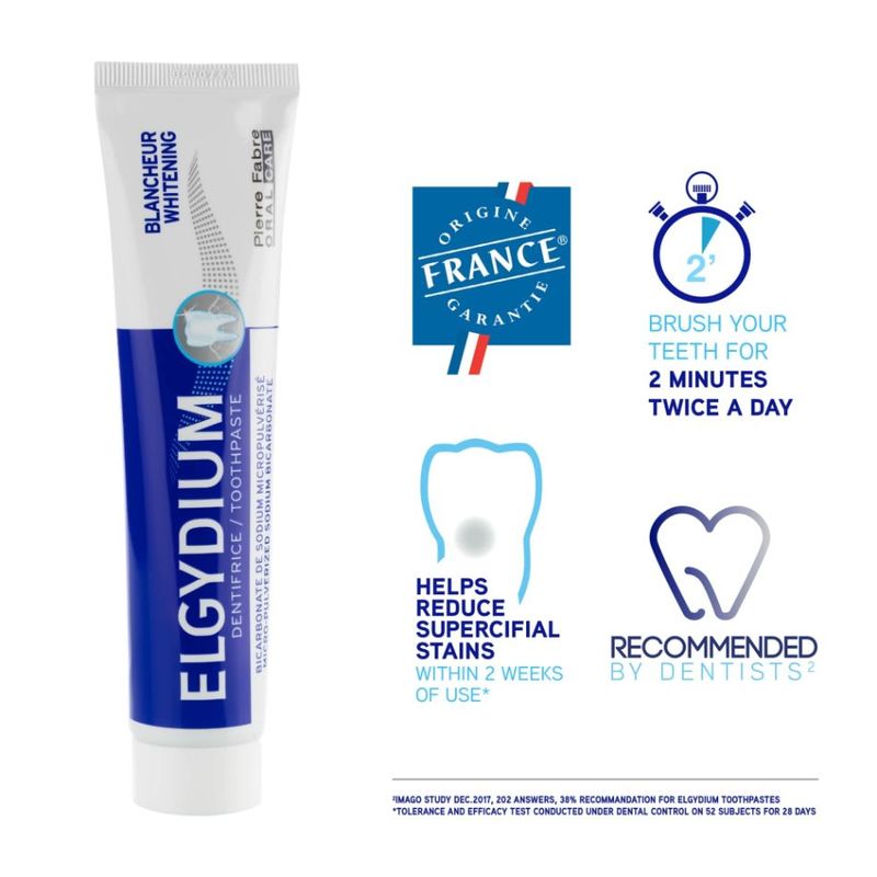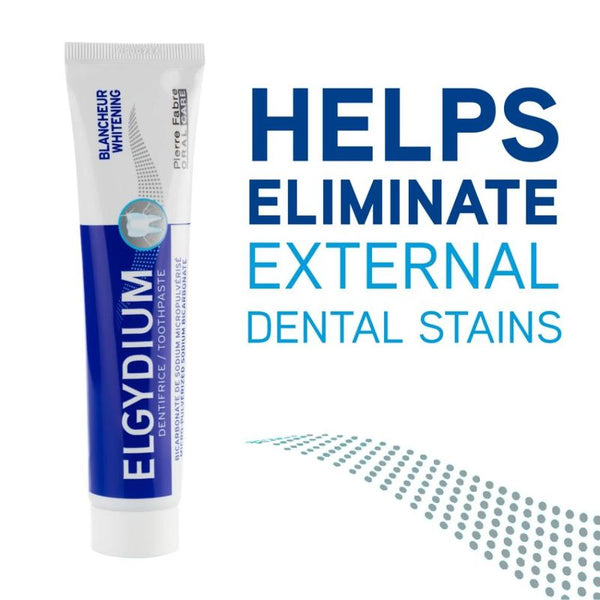 Elgydium Whitening Toothpaste-75 ML helps to remove superficial tooth discolouration (caused in particular by food and drink or smoking) while caring for the teeth. It is mint-flavoured and prolongs whiteness following tartar removal or professional whitening.