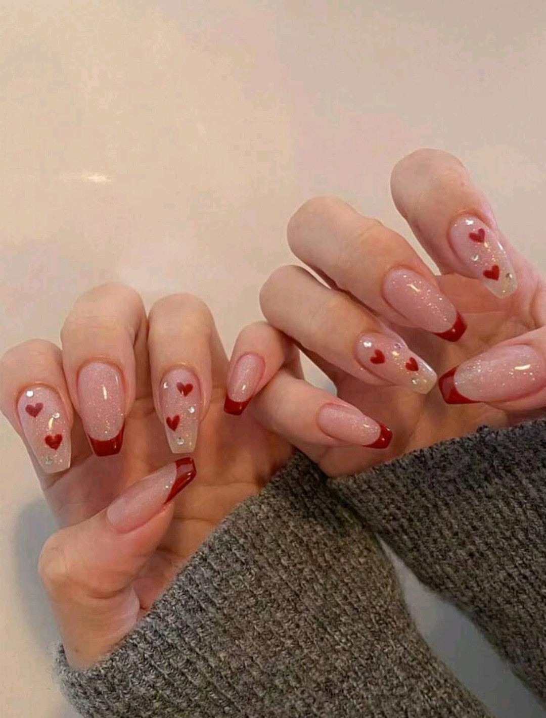 - Fake Nails 24pcs Long Coffin French & Red Heart Pattern With With Rhinestones