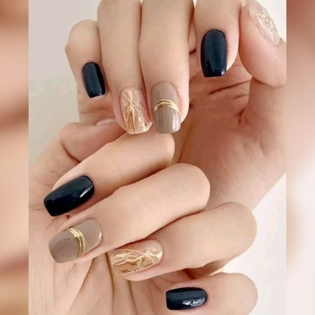 - Fake nails Short Square Black Khaki Metal Embossed Fake Nail & 1sheet Tape & 1pc Nail File