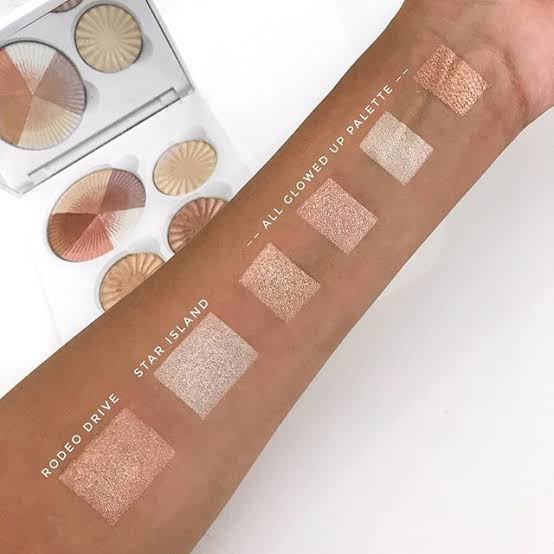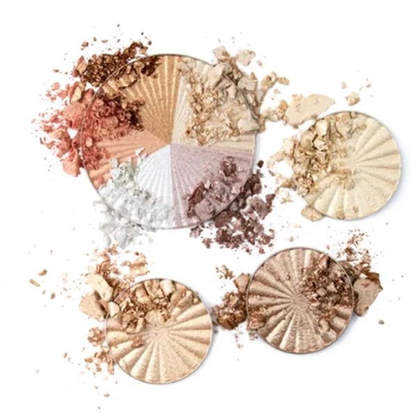 Beverly Hills (a golden bronze, cool pink, pearly white, neutral shimmer and pinky-peach) Rodeo Drive (universally flattering sun-kissed, soft gold) Blissful (golden-bronze with rose undertones) Star Island (warm ivory) -Our best glow in one palette -Liquid-to-baked for a highlight that melts into the skin without looking chalky -Magnetic and refillable -Mirror