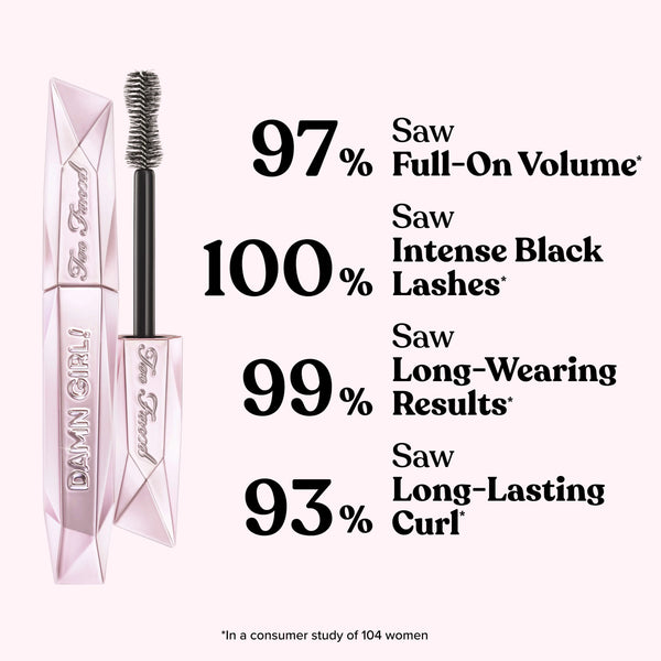 Damn Girl’s revolutionary creamy mousse formula was developed with a special blend of whipped melting waxes that deliver an immediate full load of extreme volume without a heavy feel. Innovative polymers keep lashes flexible while lifting, lengthening, and locking-in 24 hours of smudge-and flake-resistant curl.