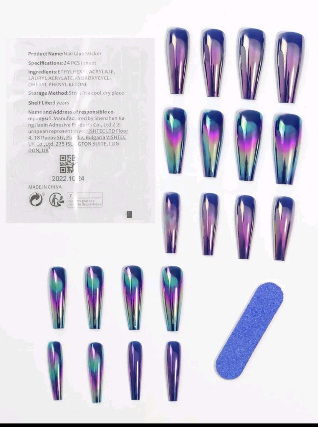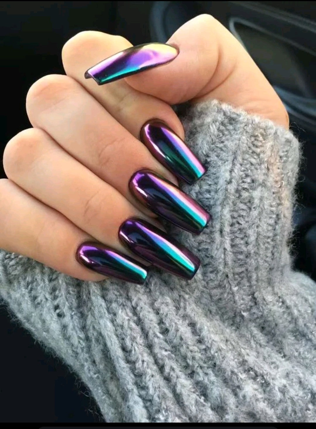 Fake Nails 20pcs Long Coffin Chameleon Metal Mirror Pigment Aurora Fake Nail & 1sheet Tape & 1pc Nail File