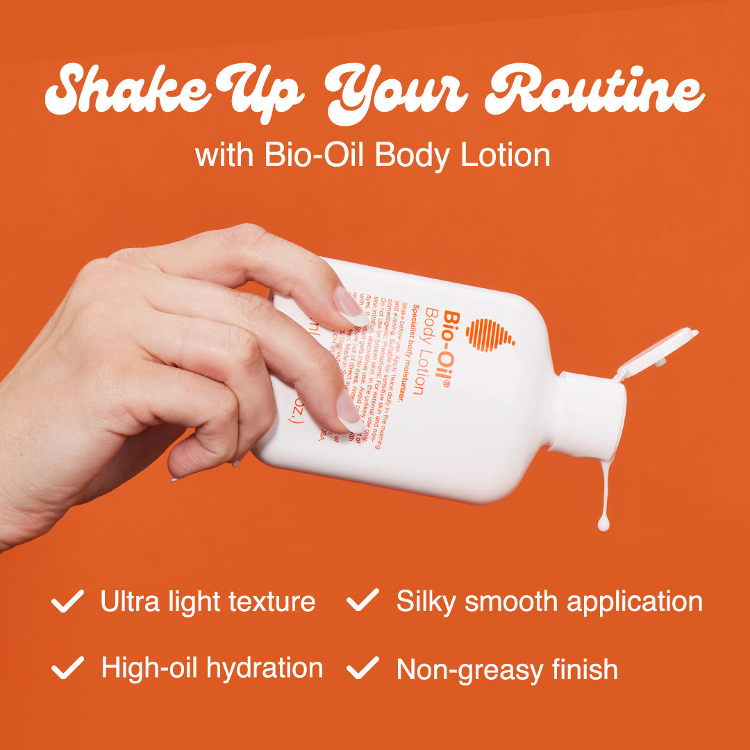 Gently shake the product before use to activate the formulation. Bio-Oil Body Lotion should be massaged in a circular motion on the body until fully absorbed. It is recommended that Bio-Oil Body Lotion be applied twice daily, morning and evening, as part of a daily skincare routine. Bio-Oil Body Lotion should not be applied to an open wound or broken skin.