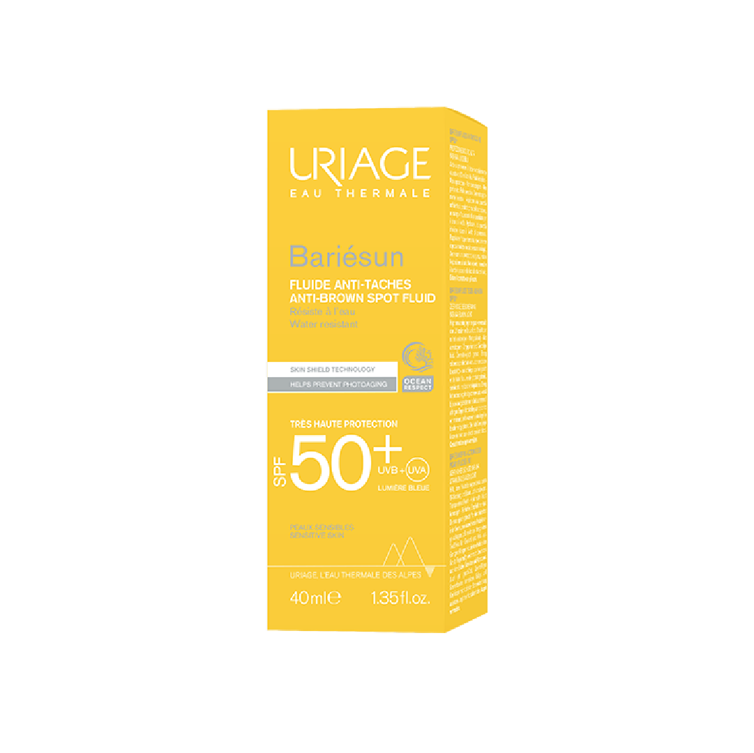 Uriage Bariesun Anti-Brown Spot Fluid SPF 50+ 40 ML: Uriage Bariésun Anti-Brown Spot Fluid Skin Shield Technology SPF50+ 40ml is a water-resistant SPF50+ anti-brown spot fluid with very high UVB-UVA-Blue Light protection for sensitive skin. It helps prevent photo-aging caused by UV and blue light. The finish is invisible, non-sticky, non-comedogenic and unscented.