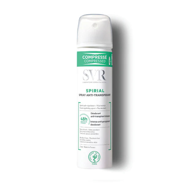 Svr spirial spray anti-transpirant provides effective and long-lasting protection against excessive perspiration and body odor for up to 48 hours. This anti-transpirant spray is specially formulated for sensitive skin and works to reduce sweating while keeping you feeling fresh and dry throughout the day. With its alcohol-free and non-irritating formula, it ensures a gentle application, making it ideal for all skin types, even those prone to irritation. The spray format allows for easy, quick, and hygienic application, ensuring even coverage. It provides a comfortable, invisible shield against wetness and odor.