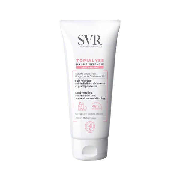 Svr topialyse baume intensif is a nourishing and intensely hydrating balm designed to restore and protect dry, irritated, and sensitive skin. Ideal for use on both the body and face, this balm helps to soothe and repair the skin's natural barrier while providing long-lasting hydration. It is specially formulated with a combination of ultra-nourishing ingredients like shea butter and omega-6 fatty acids, which work together to provide immediate comfort and intense moisturization. The balm is free from fragrances and is suitable for the most sensitive skin, including for children and adults. It also helps to reduce itching and discomfort caused by very dry skin conditions, leaving the skin feeling soft, smooth, and hydrated.