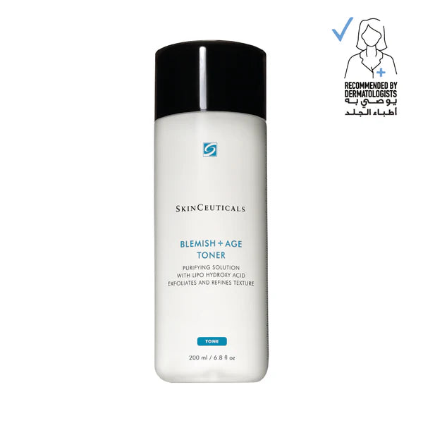 Skinceuticals blemish + age toner is a clarifying toner formulated to target both acne and signs of aging. It combines glycolic acid and salicylic acid to exfoliate, reduce excess oil, and minimize the appearance of pores while improving skin texture. The toner helps to reduce blemishes, prevent breakouts, and refine the skin's surface, promoting a clearer and more youthful complexion.