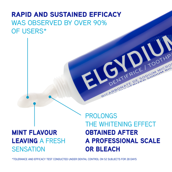 Elgydium Whitening Toothpaste-75 ML helps to remove superficial tooth discolouration (caused in particular by food and drink or smoking) while caring for the teeth. It is mint-flavoured and prolongs whiteness following tartar removal or professional whitening.