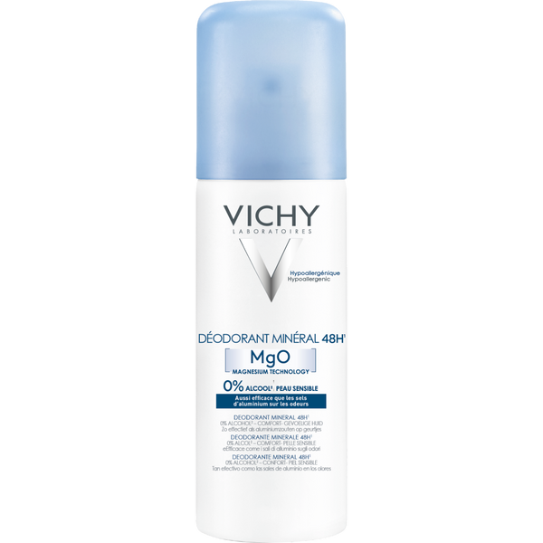 Vichy Mineral Deodorant 48H – 125 ML: The 48h- Anti-odorant Mineral Deodorant provides up to 48 hours of effectiveness without compromising tolerance. Its hypoallergenic formula with optimal tolerance combines zinc gluconate and minerals of Vichy mineralizing water for an anti-odour effect for 48 hours, but also soothing Provitamin B5.